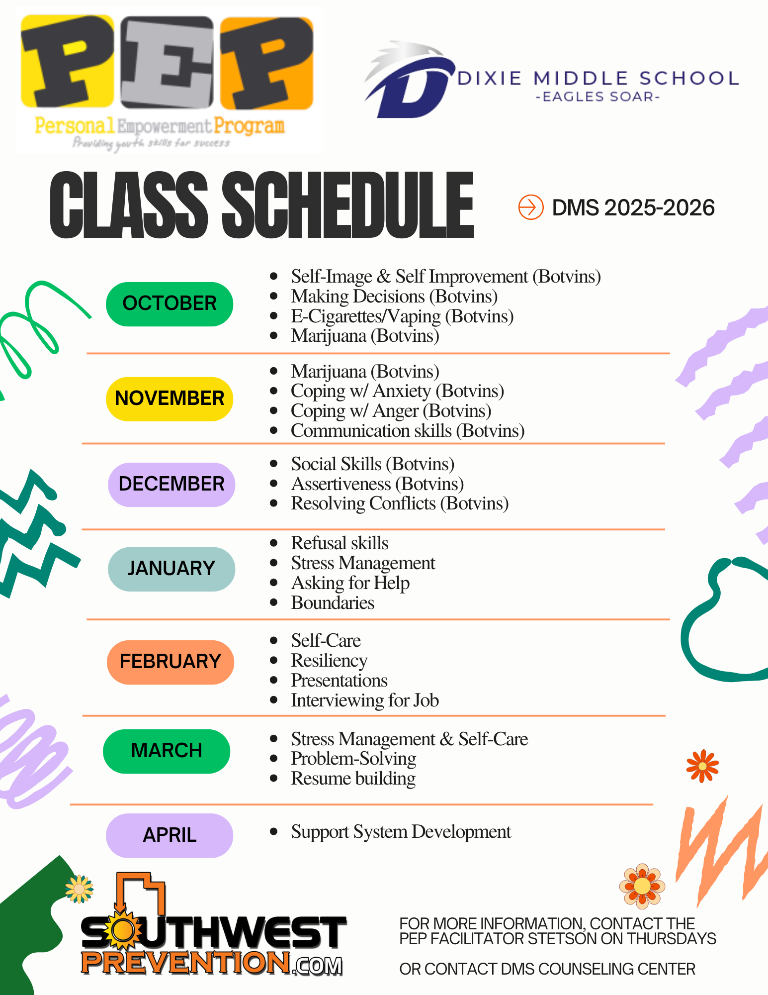 This group is run by an instructor from Southwest Behavioral Health. Students who join the group will attend at rotating times each week so they do not miss the same class each week. Each session will last 30 minutes. We know many students want to be with their friends at school. What a better way to meet up with their friends than in an environment where they will learn skills for communication, coping, problem solving, and goal setting! To sign up a student for PEP, please complete the form below: